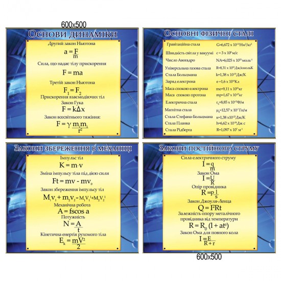 Комплект "Физические формулы" (синий) — это набор из четырёх наглядных стендов для кабинета физики. На стендах представлены основы динамики и законы Ньютона, физические постоянные, законы сохранения в механике, а также законы постоянного тока. Формулы поданы чётко и структурировано, что помогает учащимся быстро ориентироваться в учебном материале. Спокойная синяя цветовая гамма не отвлекает и идеально подходит для ежедневного использования на уроках физики.