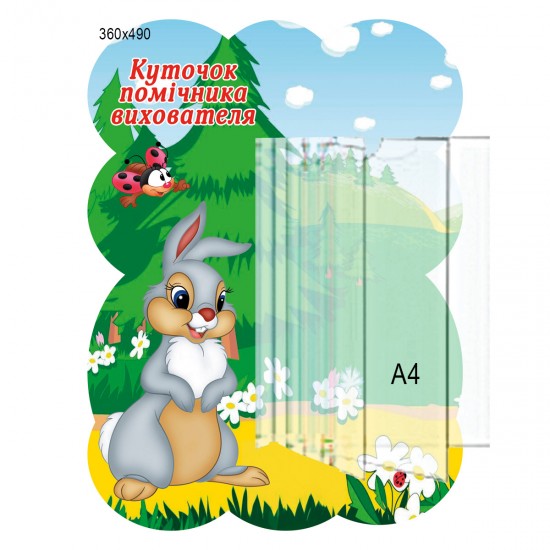 Стенд "Куточок помічника вихователя" — яскравий фігурний стенд для дитячого садка, створений для зручної організації щоденної інформації. На стенді є перекидна кишеня, у яку можна помістити розклад, плани занять, списки чергувань, оголошення для батьків чи корисні поради.