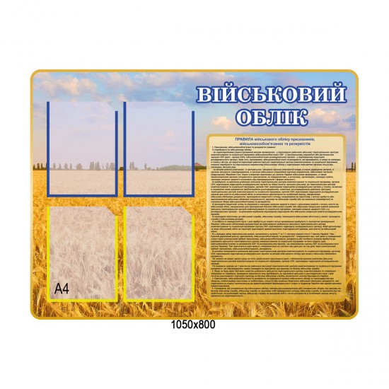 Стенд "Військовий облік" – це не тільки естетично привабливий елемент оформлення, але й важливий інструмент для інформування та виховання. Його якісні матеріали і ретельно продуманий дизайн забезпечують довговічність та ефективність у передачі інформації. Він стане корисним доповненням для будь-якого закладу, де необхідно підвищити обізнаність щодо питань військового обліку і сприяти патріотичному вихованню.