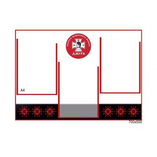 Виконаний у традиційних червоному, білому та чорному кольорах з українським орнаментом, стенд привертає увагу й гармонійно доповнює інтер’єр. Зручні прозорі кишені дозволяють легко оновлювати інформацію про гру, учасників чи результати змагань.
